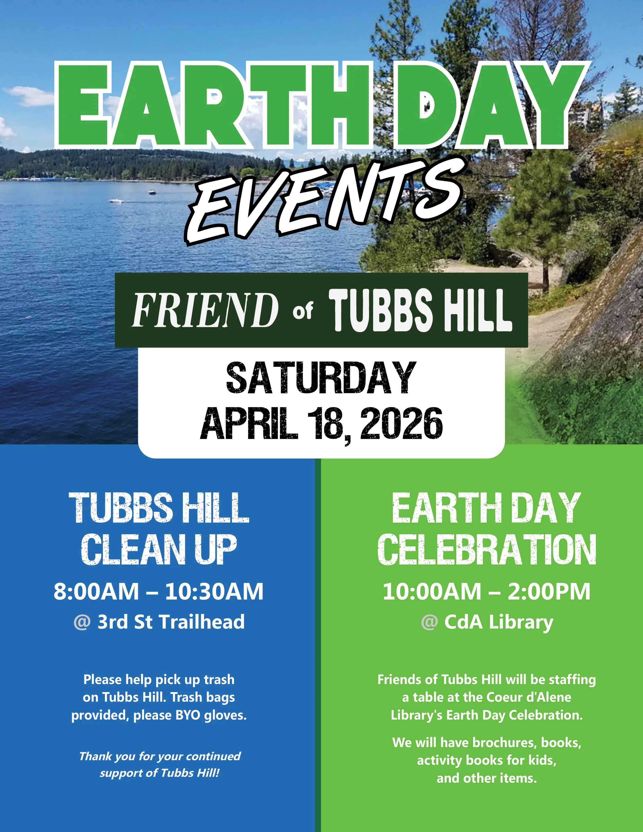 Saturday April 20: Clean-up 8-10:30am, Celebration 10am-2pm. Friends of Tubbs Hill will be staffing a table at the Coeur d'Alene Library's Earth Day Celebration. We will have brochures, books, activity books for kids, and other items. We also will be staffing a table starting at 8am at the 3rd Street trailhead for those wishing to help pick up trash on Tubbs Hill. Trash bags provided, please BYO gloves.